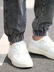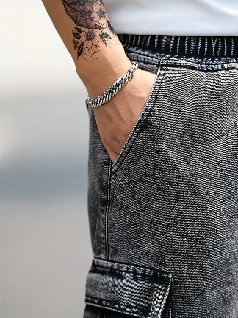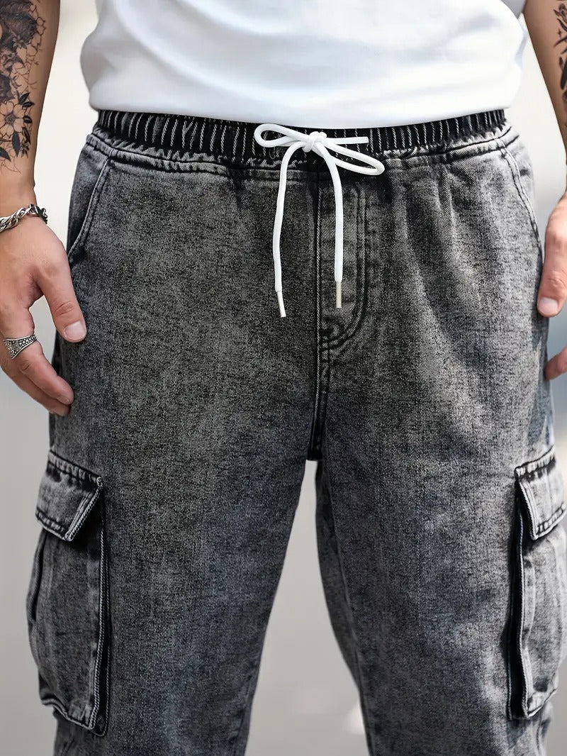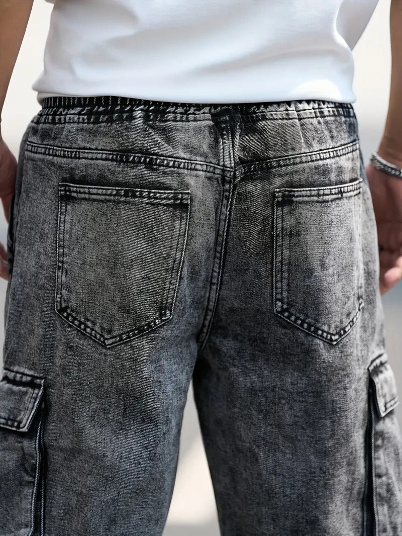Men's Casual Denim Jeans with Adjustable Elastic Waist, Flap Pockets & Washed Finish