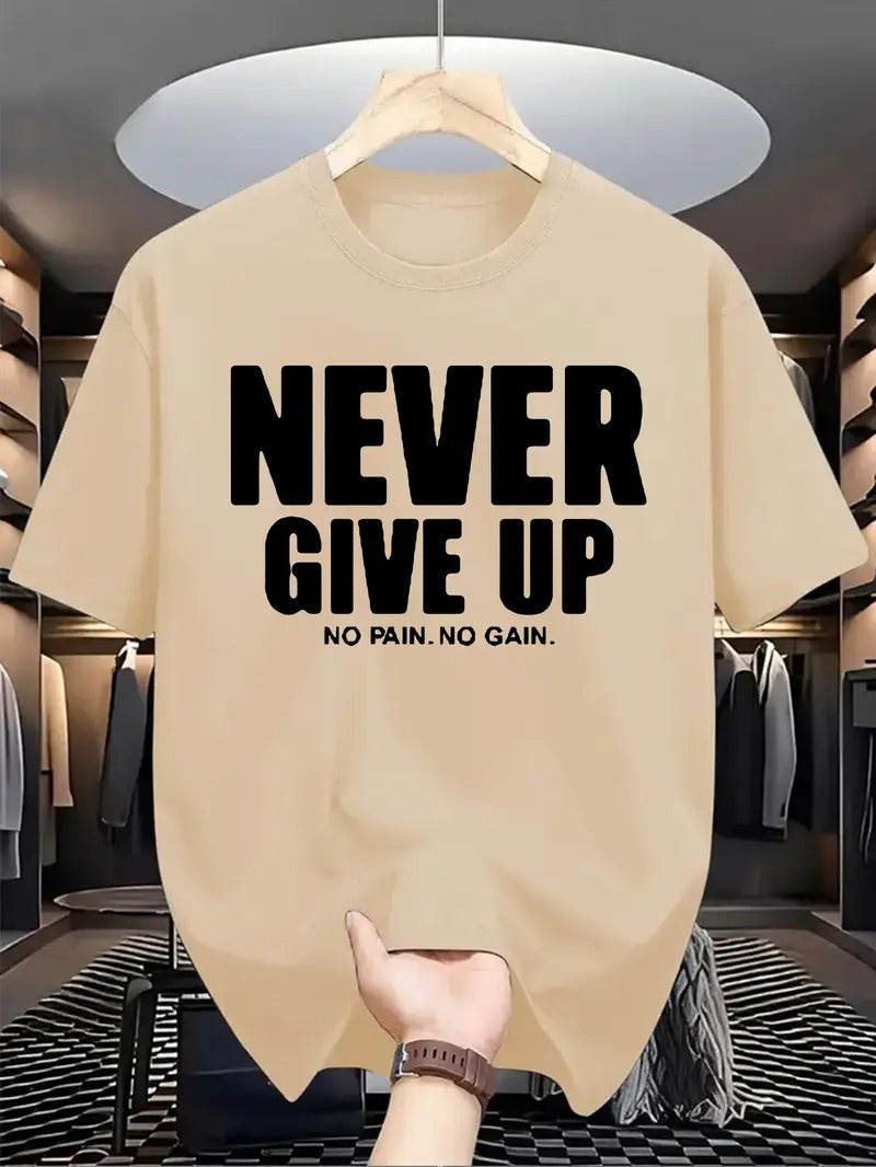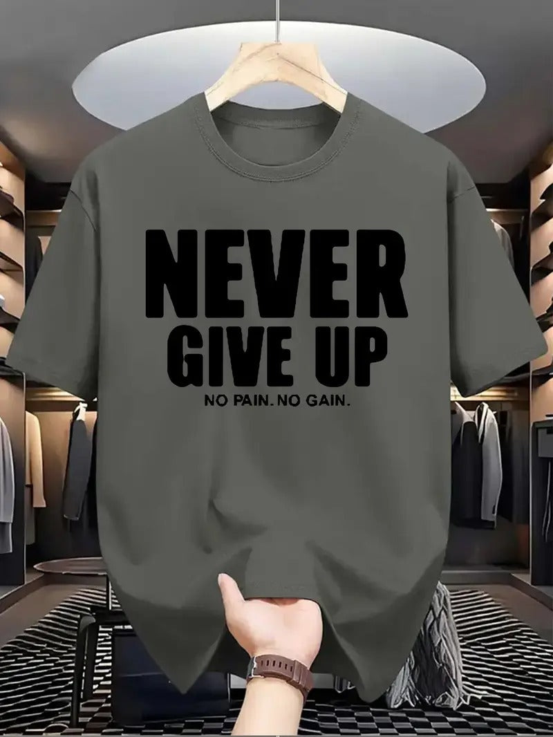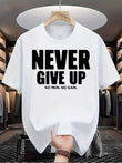 Men's Motivational "NEVER GIVE UP" Graphic Print Short Sleeve T-Shirt - Dark Green, Regular Fit, Round Neck, Summer Casual